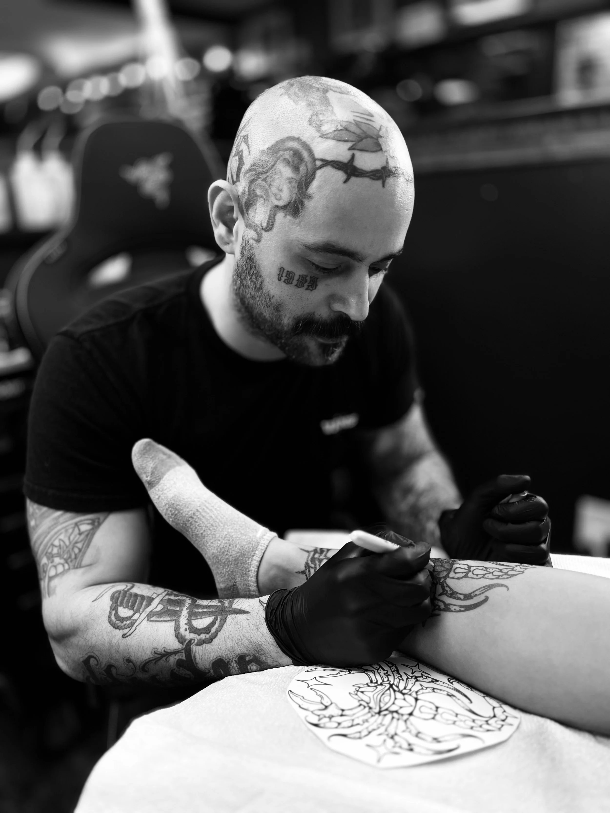 Genuine sweetie, family man. Loves boxing. Does an incredible Arnold Schwarzenegger accent. Will sing in your ear while tattooing you.